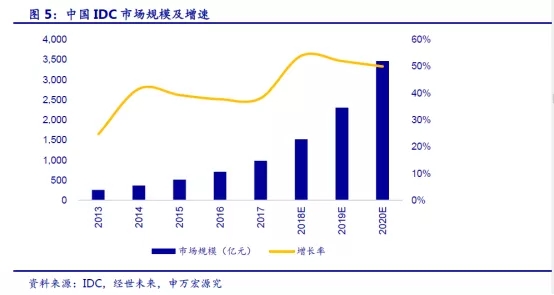 预计随着5G、物联网、产业互联网、人工智能等终端侧应用场景的技术演进与迭代,终端侧上网需求量将呈现指数级增长,同时对数据中心的应用场景也将进一步扩大,2020年中国市场规模将超过2000亿元。