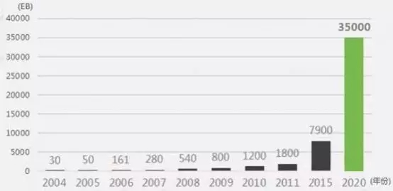 数据来源:IDC发布的《IDC数字宇宙研究报告》。从图中数据折算,几乎接近18个月翻番。