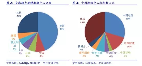大幅领先全球同业增速背后,是中国数据中心产业基数的相对薄弱:虽然以8%的占比,是为全球第二大市场;但2018年1200亿元的市场总规模,相比美国拥有全球44%的大型数据中心份额,仍不足其1/5体量。