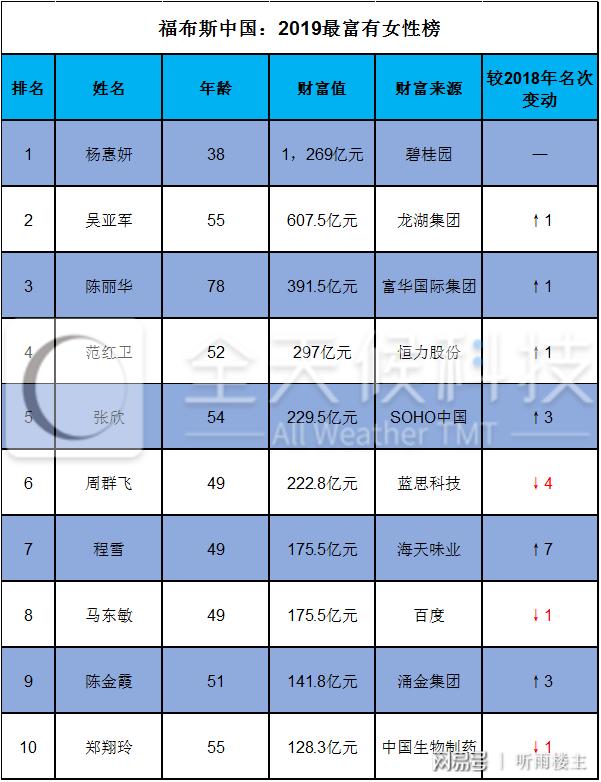 福布斯中国还指出,首次进入榜单的的六位新晋女富豪中,最引人注目的就是海底捞两位联合创始人——舒萍、李海燕,她们分别是海底捞董事会主席张勇、董事施永宏的夫人。随着海底捞赴港上市,张勇、舒萍夫妇和施永宏、李海燕夫妇作为最初的创始团队,身价大涨。但从目前公布的榜单中,暂时无法看出舒萍和李海燕拥有的财富值。