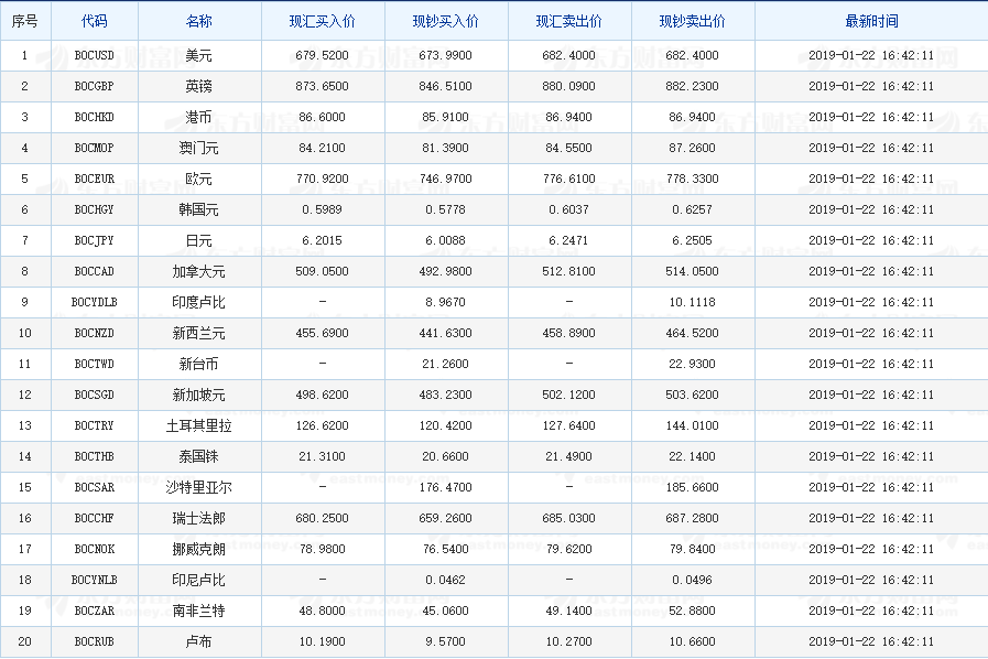 中国银行外汇牌价 2019-01-22(图片来源:东方财富网)