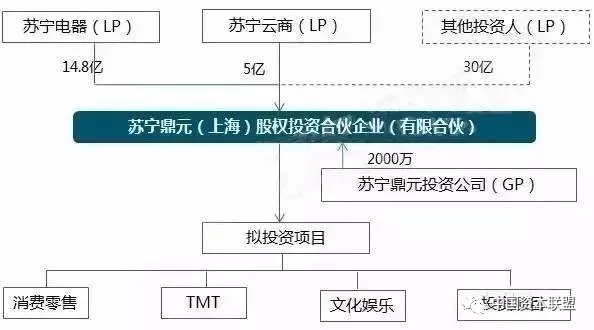 基金结构:基金拟募集规模50亿元,首期20亿元,由苏宁电器和苏宁云商各认购14.8亿元和5亿元,GP苏宁鼎元投资认缴2000万。后续将由基金的普通合伙人根据基金发展情况和潜在的项目投资进展向外部投资者募集资金,也可由公司在履行相应的审批程序后对该基金进行增资或者参与后续子基金的募集。外部投资人参与的方式可以是直接对该基金进行增资也可以通过组建子基金的方式参与。