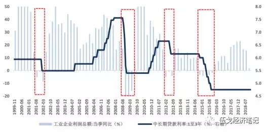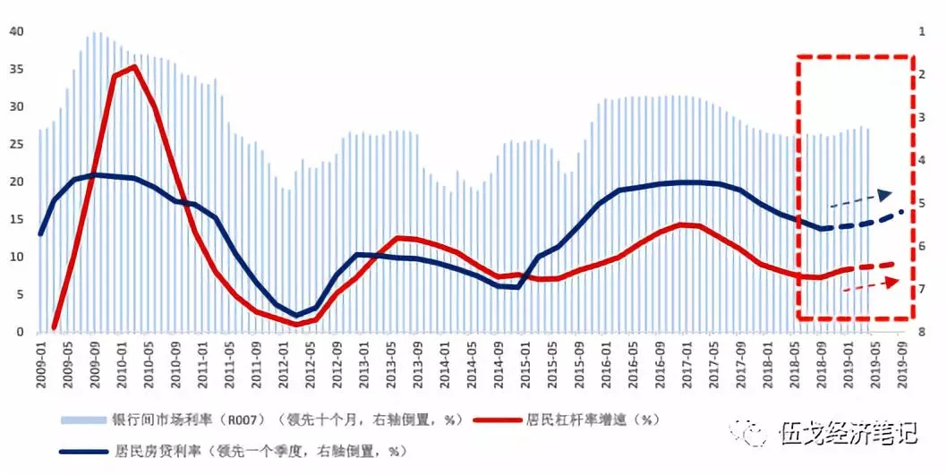 二是逆周期调节政策作用下,政府和居民杠杆率增速将有所回升。内外需放缓将促使政府杠杆率增速抬升。随着银行间市场利率下行向房贷端的传导,居民杠杆率增速也将小幅回升。历史上,当企业利润增速为负时,贷款基准利率下调的窗口就随之打开,目前该概率正在加大,或将支撑各杠杆率的抬升。
