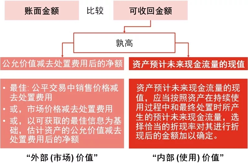 《资产减值》会计准则进一步要求,当资产存在减值迹象时,应当估计其可收回金额。可收回金额应当根据资产的公允价值减去处置费用后的净额与资产预计未来现金流量的现值两者之间较高者确定。
