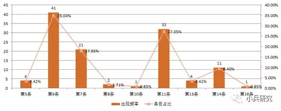 资产评估机构违反工作底稿评估准则的条款涉及第5条、第6条、第7条、第8条、第10条、第11条、第13条、第14条、第16条等9项,第6条出现的频率最高、达到41次,之后是第11条的32次、第7条的21次。