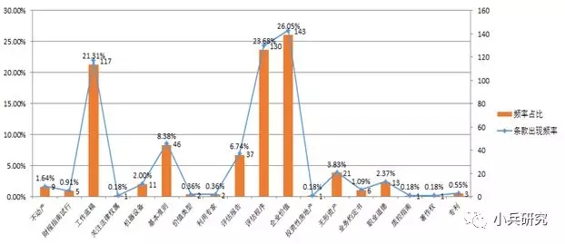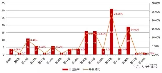 资产评估机构违反评估程序准则的条款涉及第6条、第9条、第10条、第12条、第13条、第14条、第15条、第17条、第18条、第19条、第22条、第23条、第24条、第25条、第26条、第27条、第29条等17项,第24条出现的频率最高、达到31次,之后是第26条的19次、第19条和第22条的16次。