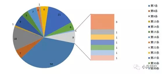 资产评估机构违反企业价值评估准则的条款涉及第7条、第8条、第9条、第13条、第14条、第15条、第16条、第17条、第22条、第23条、第27条、第30条、第36条、第37条、第40条、第41条、第44条、第45条、第46条、第51条等20项,第7条出现的频率最高、达到50次,之后是第27条的21次和第9条的18次。