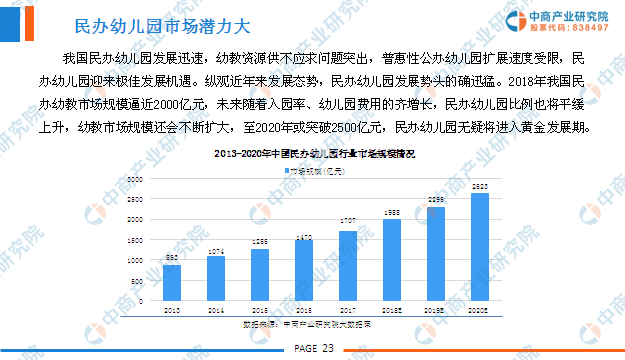 纵观近年来发展态势,民办幼儿园发展势头的确迅猛。2018年我国民办幼教市场规模逼近2000亿元,未来随着入园率、幼儿园费用的齐增长,民办幼儿园比例也将平缓上升,幼教市场规模还会不断扩大,至2020年或突破2500亿元,民办幼儿园无疑将进入黄金发展期。