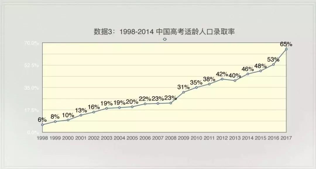 第三组数据,这是中国高考录取率的统计,教育局统计的是一百人参加高考有多少人上大学,这个统计是平均一百个人里面有多少人可以上大学。