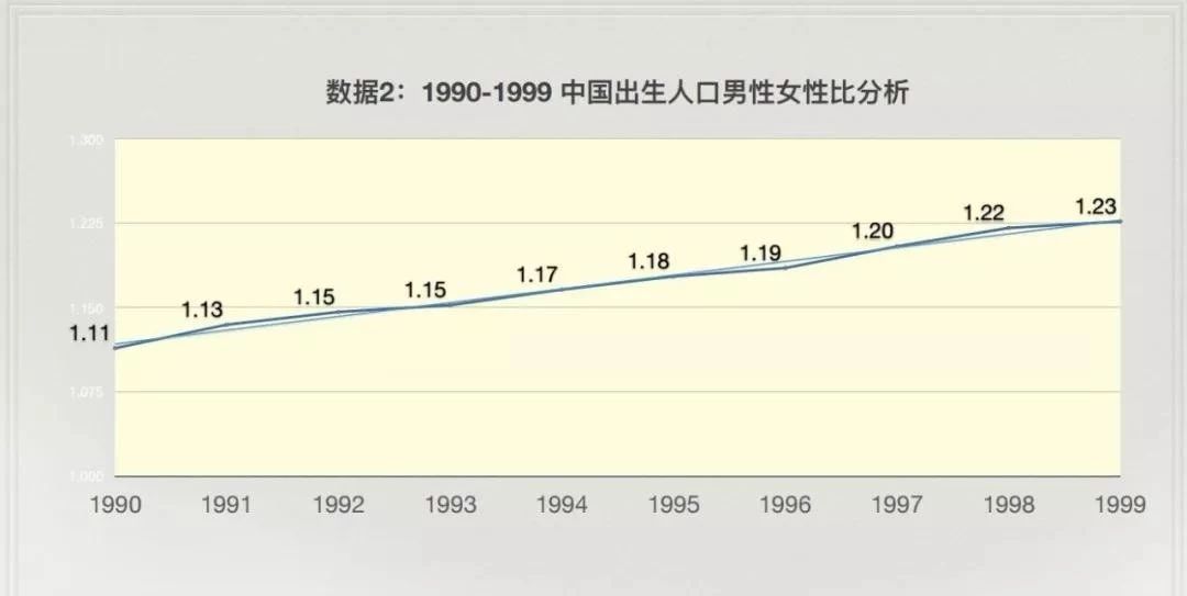 这是上个世纪90年代新出生婴儿里面性别比例不断的失衡。从1980年开始中国新出生婴儿103个男孩对100个女孩,1990年是111个男孩对应100个女孩,1999年达到了高峰123个男孩对100个女孩。