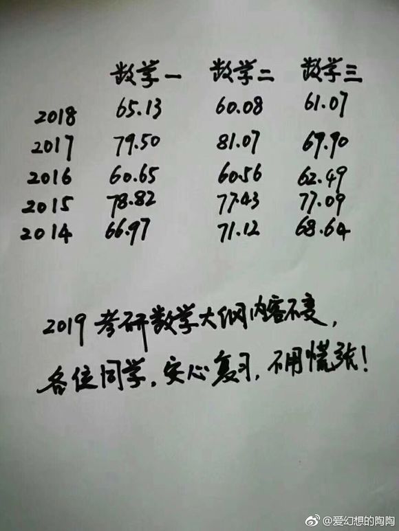 鉴于大样本下考研数学当年平均分在70-75分难度适中,超过75分难度偏易,低于70分难度中上,低于65分难度过大。从近四年的数据来看,数一数二的难度呈现过山车式的波折,数三的难度则一直很大。因此预测,19年数一数二会偏容易,它们的平均分会在75分左右,由于经管类专业一直大热,所以数三难度一直会很大,均分应该还会是60多分。