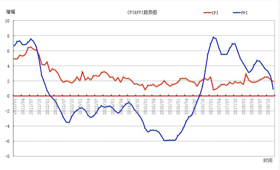 最后,再看一组数据——PPI和CPI的运行趋势。