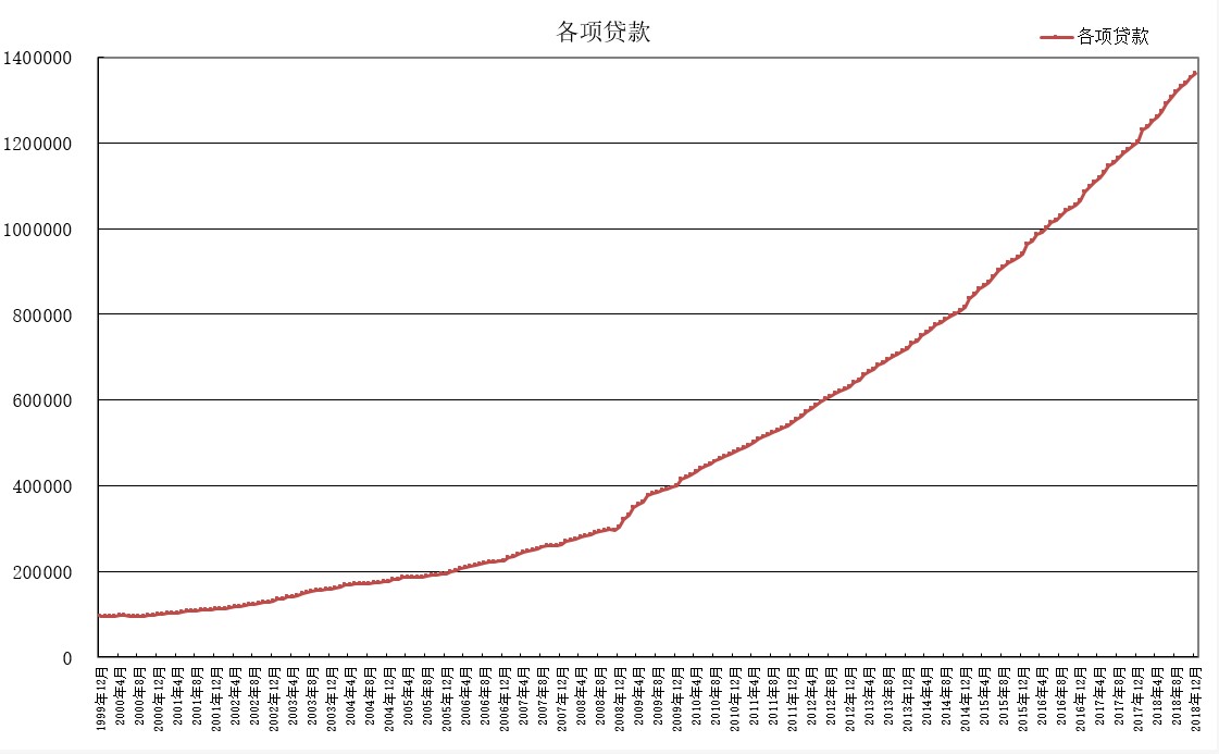 下面图形,就是我国银行各项贷款的规模,即社会中的间接融资规模(债务因素)。