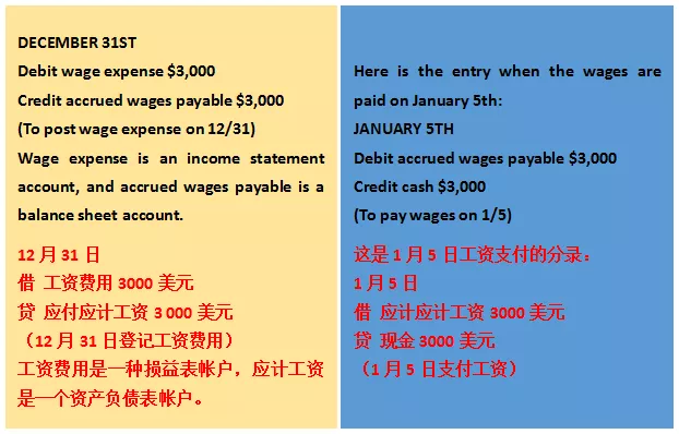 当你看到关于调整分录的问题时,请记住,分录需要一个资产负债表和一个损益表帐户。例如,假设在12月的最后一周,你欠了3000美元的工资,而工资将在明年1月5日之前支付。