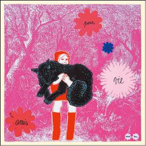 小红帽方巾上重新演绎童话故事小红帽,小红帽像抱宠物般抱着大野狼走在森林里,