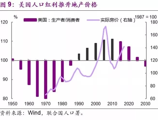 美国的人口红利自1987-1988年开始,房价也保持上涨态势,并在2007-2008年达到顶点,现在房价虽有回升,但从人口结构的逻辑看,人口红利已经出现拐点,美国的实际房价可能难回顶点(图9)。