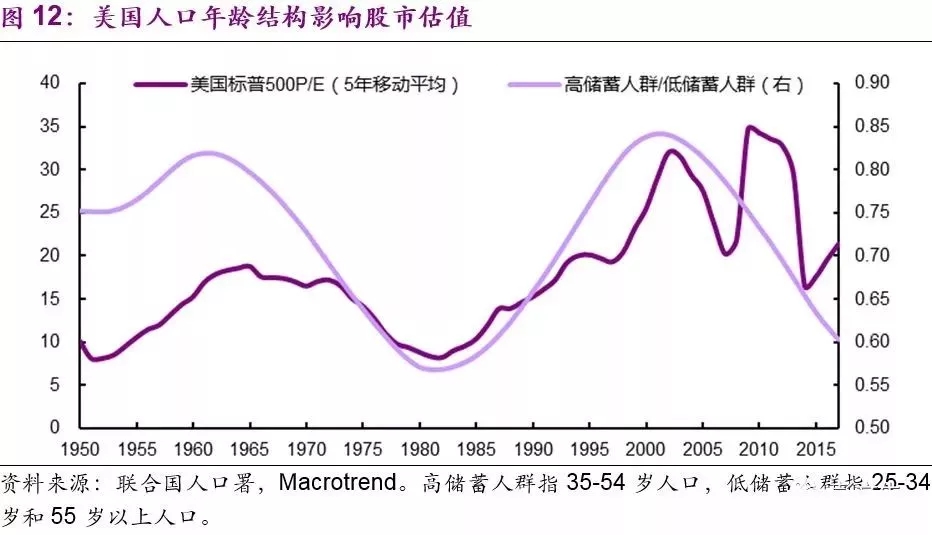 人口年龄结构也影响股市估值。观察美国SP500指数的PE(5年移动平均)以及高储蓄人群与低储蓄人群之比,美国股票估值的大方向与人口年龄结构走向较为一致。其中高储蓄人群定义为35~54岁人口,低储蓄人群定义为25-34岁和55岁以上人口。25~34岁人口面临成家、抚养孩子问题,往往需要借钱,35岁之后储蓄能力增强,投资意愿提高包括投资股票。按照这个逻辑,目前美国股票估值较高,随着人口年龄结构的变化,美国股市估值存在较大的下行压力(图12)。