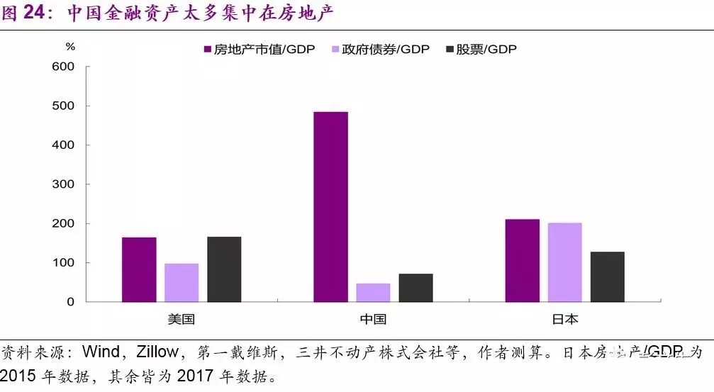第三类是投资房地产,对个人来讲这可能是常见的养老资产,中国尤其如此。和美国、日本比较,中国的房地产在金融资产中的占比突出地高,和GDP 比较,也显示中国房地产的估值极高(图24)。