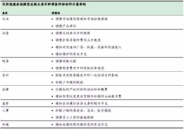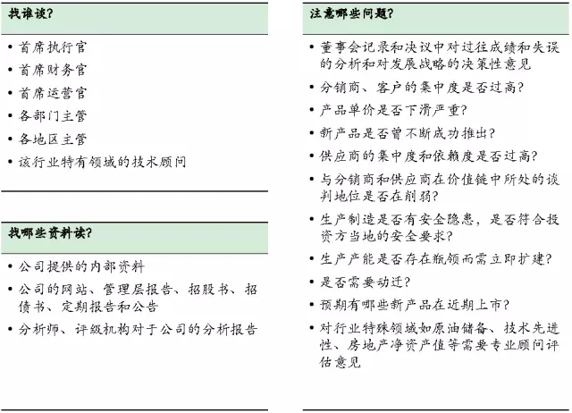 理解公司业务和运营的各主要方面,从侧面验证公司的优势和不足以及公司发展战略的有效性,对兼并收购后所能产生的收入和成本等方面协同效应作估计。