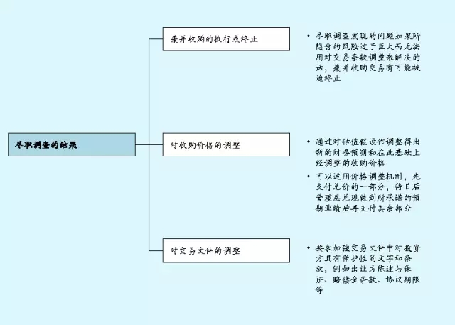 买方和卖方之间存在着信息不对称,买方所获得的信息也是不完备的,尽职调查可以减少这种信息的不对称,尽可能地降低买方的收购风险;尽职调查的结果和买方对风险的承受能力可能决定了并购是否能继续往前推进;尽职调查的结果也是买卖双方估值讨论的基础;尽职调查也是买卖双方知己知彼从而编制合并后合作业务计划书的基础。