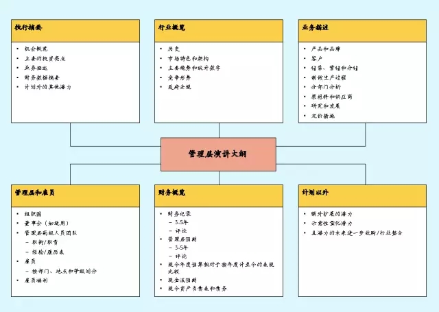 管理层介绍会一般在潜在投资方参观了资料室后举行,这使投资方能问及一些在保密信息备忘录和数据室中没有提供的信息;另外管理层介绍会也是买卖双方直接借此接触了解对方性格、素质、诚信的最佳时机。