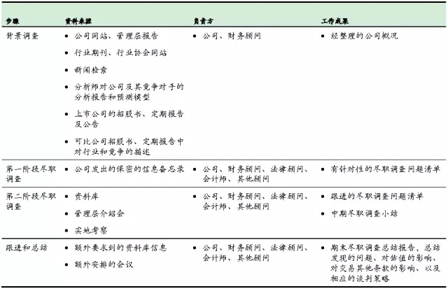 尽职调查的流程主要包括:背景调查、两阶段的尽职调查以及跟进和总结.