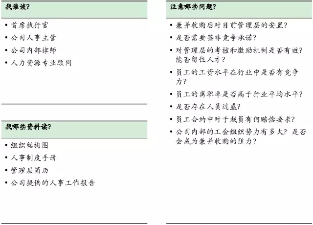 理解目前的人事制度、人力资源结构,确保没有对社保机构拖欠员工福利,提前为兼并收购带来的人事变动做好准备。