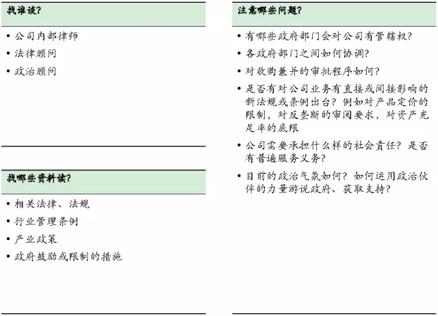 理解公司所处的政治和监管环境,理解兼并收购所涉及的审批程序,以便及早开展游说工作、获得支持、降低获准审批的不确定性。