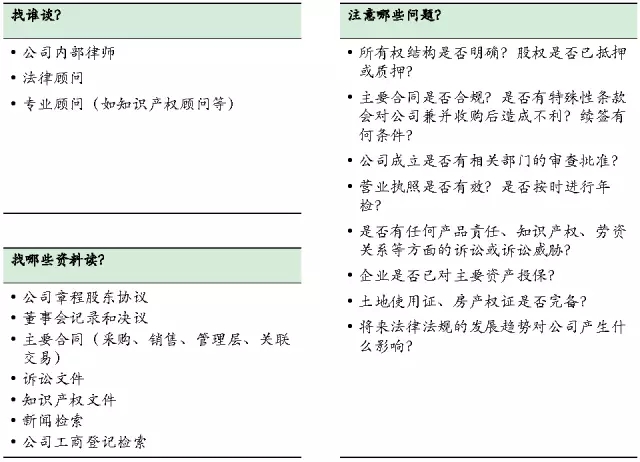 确保公司依法成立并拥有经营其业务的营业执照,找出任何实际的和潜在的法律诉讼;法律风险可能会影响财务(例如赔偿损失)甚至于直接影响业务(例如停业整顿或回收已销售产品等)。