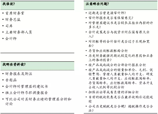 确认公司财务报表的真实性和准确性,理解生成财务报表背后的内控机制、报告机制、会计假设和估计,对历史财务报表作趋势分析,对公司的税务合规性进行确认。