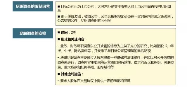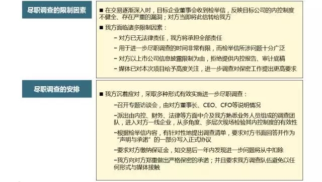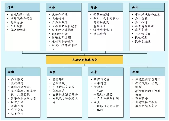 尽职调查就其范围而言需对公司的业务、财务、法律等各方面作全面的评估,从而降低交易的风险,减小交易的成本。