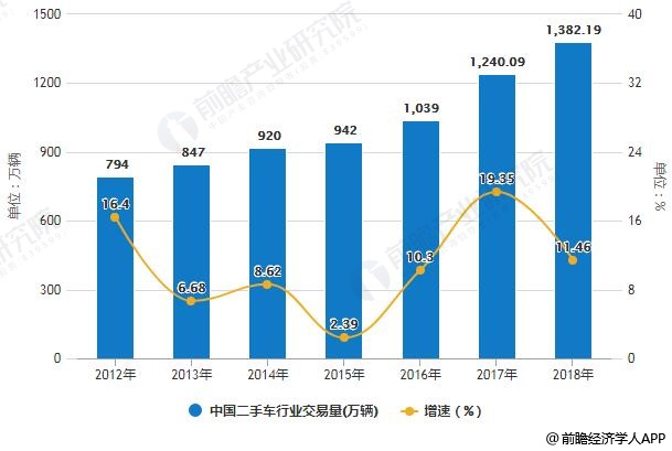 相比之下,二手车市场看起来似乎好一些。据前瞻产业研究院发布的《中国二手汽车行业市场需求预测与投资战略规划分析报告》统计数据显示,2018年12月,中国二手车交易121.72万辆,环比下降4.58%,同比下降1.11%,交易金额达769.76亿元,这是2018年单月交易量同比首次下滑。累计方面,2018年1-12月全国累计完成交易二手车1382.19万辆,同比增长11.46%,交易金额为8603.57亿元。从2001年至今,中国二手车交易量已经连续第18年持续增长,全国交易量从37万辆增长至1382万辆,增长了37倍。