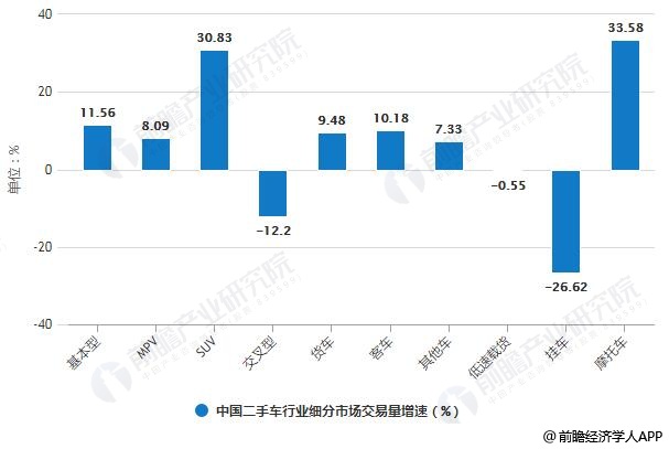 从细分市场的交易情况来看,2018年基本型乘用车共交易822.20万辆,同比增长11.56%;SUV交易量113.56万辆,同比增长30.83%;MPV交易量为78.19万辆,同比增长8.09%。可见二手SUV是带动2018年二手车市场增长的主要力量,同比增速超过30%。