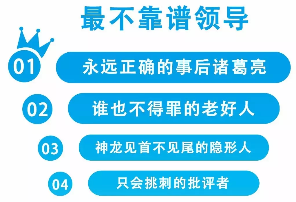 第一,所谓“不靠谱”的领导者类型一共分四种,他们分别是“只会挑刺的批评者““神龙见首不见尾的隐形人”“谁也不得罪的老好人”以及“永远正确的事后诸葛亮“。