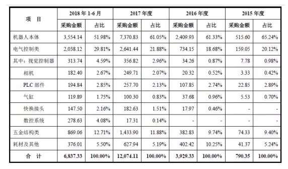 报告期内,公司主要原材料的采购金额及占比情况如下: 公司主要原材料包括机器人本体、电气控制类、五金结构类、耗材及其他等。