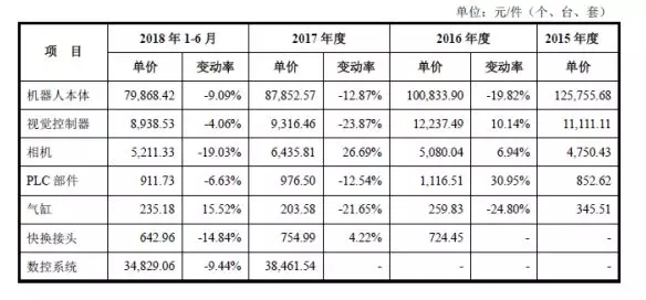 报告期内,公司主要原材料的采购价格及变动情况具体如下表所示: 公司机器人本体品牌主要包括ABB、KUKA、FANUC和新时达等,机器人本体的采购单价呈逐年下降趋势,主要是受机器人本体品牌、型号及价格等因素影响。不同品牌及型号的采购价格不同,但总体来说就算是“四大家族”的机器人本体,价格也已经是相当亲民了。