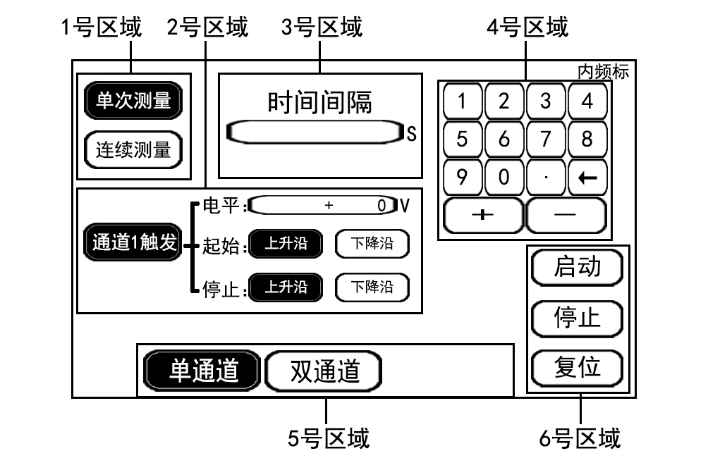 f) 6号区域代表:系统控制区域。当配置好相应的设置后,按下启动键,就开始进行时间间隔的测量。按下停止键,停止时间间隔的测量。按下复位按键,复位最后一次配置。