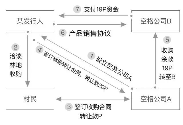 如图2所示,发行人第一步是先设立一家空壳公司A,专门用于与村民签订林地使用权转让合同;第二步是发行人与村民洽淡好林地使用权转让条件;第三步由空壳公司A与村民签订林权转让协议,并按约定支付村民转让款;第四步是空壳公司A与发行人签订林权转让协议,发行人按高价支付转让款;第五步是空壳公司A将剩余未使用完的林权转让款划转到空壳公司B;第六步是发行人与空壳公司B签订商品销售协议,空壳公司B将收到的林权转让款转回至发行人。经过上述过程后,除实际支付村民的林地转让款P外,其余资金19P从发行人以收购无形资产名义转出后,经空壳公司A、B,以销售回款的形式又转回发行人,实现了资金的循环,同时发行人账面虚增了19P的无形资产和19P的营业收入。