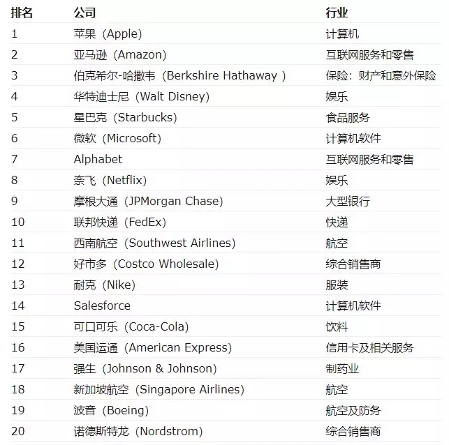《财富》杂志发布“2019年全球最受赞赏公司排行榜”最近新鲜出炉。前20强可见下图。