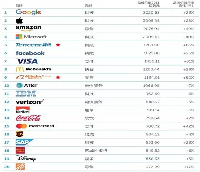 前10名中,科技或科技相关品牌占据八席。科技类品牌继续统治榜单,谷歌和苹果仍分别把持排行榜第一、二位:谷歌品牌价值增长23%,达到3021亿美元;苹果增长28%,达到3006亿美元。