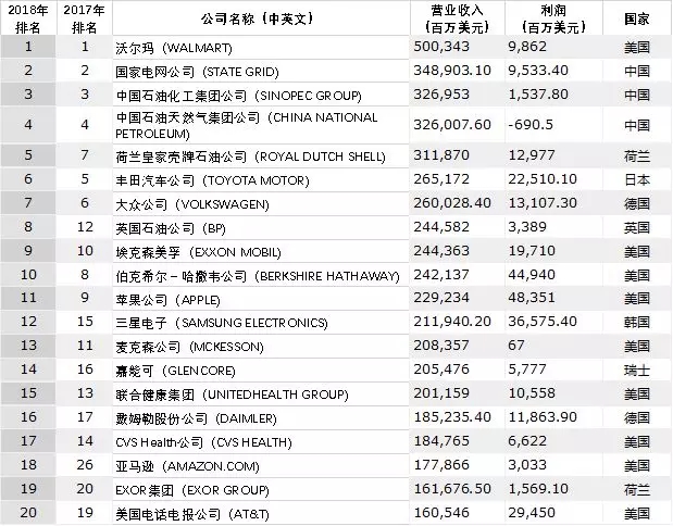 北京时间2018年7月19日晚,财富中文网全球同步发布了最新的《财富》世界500强排行榜。前20强可见下图。