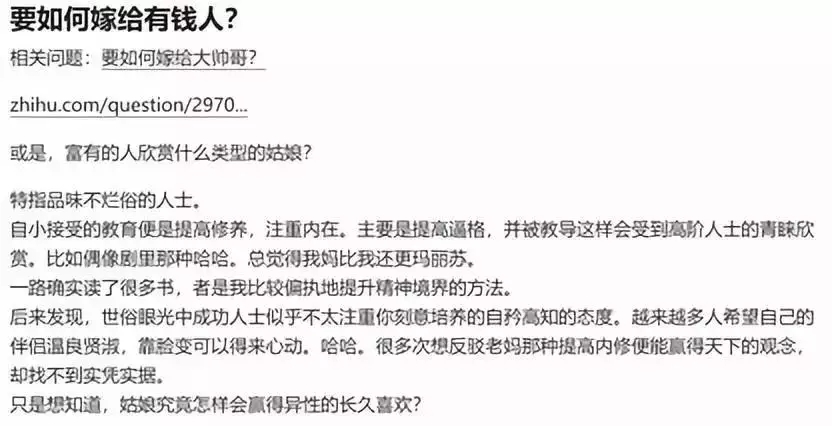 昨天刷知乎,看到一个姑娘的提问,很有意思。她说:“要如何嫁给有钱人?”