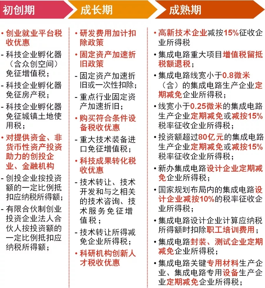 对于半导体行业,我国出台了大量的税收优惠政策予以扶持。这些优惠政策不仅覆盖了半导体行业全产业链,更涵盖了企业整个生命周期,从企业设立初期便有机会享受一系列税收优惠政策,直至企业成熟期乃至上市。国家税务总局颁布的《“大众创业万众创新”税收优惠政策指引》,按照初创期、成长期、成熟期,对于半导体行业可享受的税收优惠政策进行了汇总和梳理,便于企业参考。