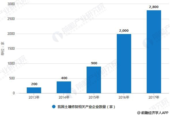 据中国环联介绍,近两年来,从事我国土壤修复的公司的数量出现了较大幅度的增长,2016年我国土壤修复相关产业的企业数量达2000家,而2017年这一数量增至2800家。