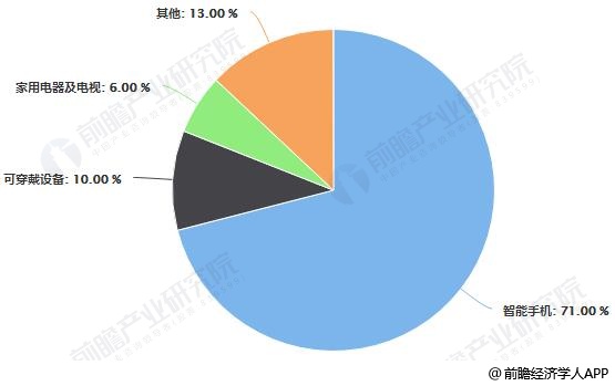 OLED广泛应用于智能手机、 电视、电脑、平板、可穿戴设备、VR 领域。未来,随着技术的进步,OLED面板将在各个领域的渗透率都有所增加。据统计,2018年, 智能手机领域是OLED应用的最大领域,占比达71%;其次是可穿戴设备,占比达10%;家用电器及电视,占比达6%。