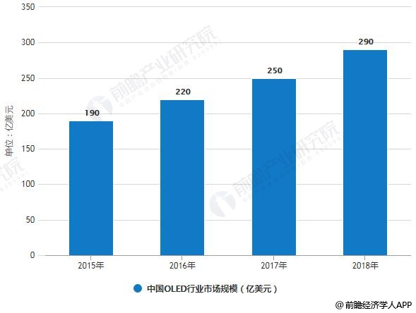 据前瞻产业研究院发布的《中国OLED产业市场预测与投资前景分析报告》统计数据显示,2015年中国OLED行业市场规模已达190亿美元。2016年中国OLED行业市场规模突破200亿元。到了2017年中国OLED行业市场规模增长至250亿美元。截止至2018年底中国OLED行业市场规模达到了290亿美元。预计未来,OLED行业市场规模还将继续高速增长。