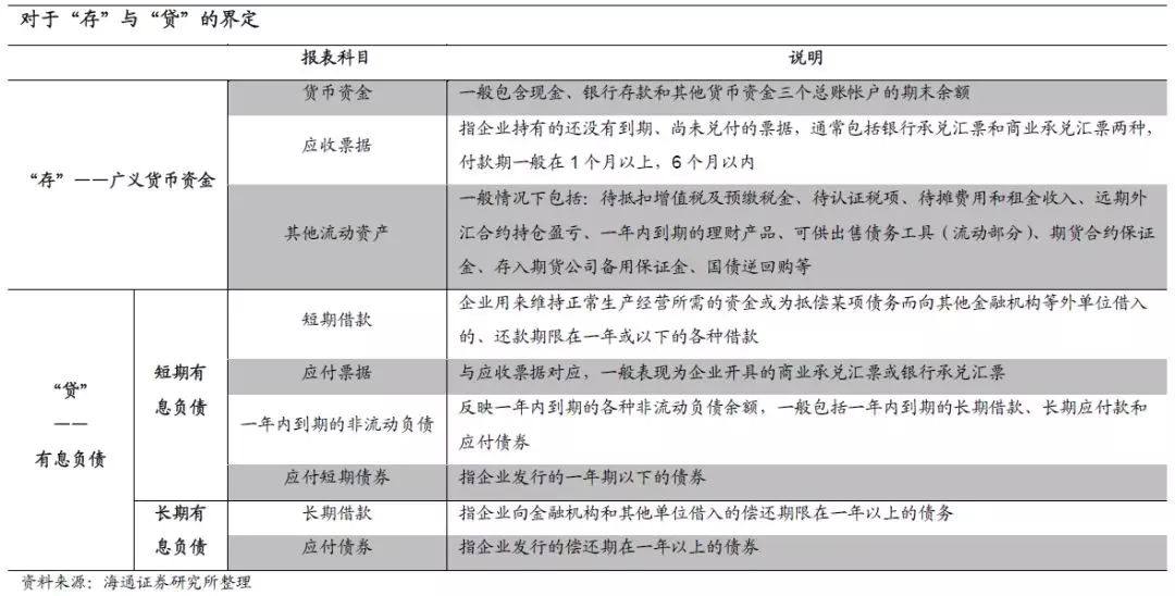 2. 如何看待存贷双高?2.1 什么是存贷双高?存贷双高中“存”的定义。存贷双高指公司账面显示的货币资金与有息负债同时处于较高水平。”货币资金”科目中的非受限部分一般是公司可以自由动用的资金,除此之外,许多公司购买的理财产品计入“其他流动资产”科目,“应收票据”一般包括商业承兑汇票和银行承兑汇票,变现能力也较强。因此我们定义这里的“存”为广义货币资金,数额等于货币资金、应收票据和其他流动资产三个科目的总和。下文提到的货币资金均指广义货币资金。