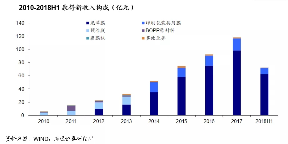 1.1 康得新:无违约历史的光学膜龙头企业光学膜龙头企业。康得新成立于2001年,作为一家材料高科技企业,主要从事高分子材料的研发、生产和销售,包括新材料、智能显示和碳材料。从收入构成上看,2012年开始光学膜逐渐占据公司收入的重要地位,2018H1光学膜收入占总营业收入的86.58%。