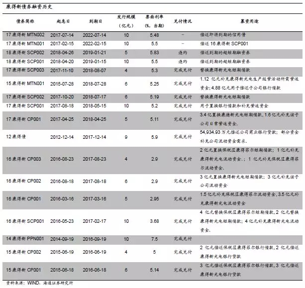 此前无违约历史。2010年康得新于深交所上市,2012年发行第一只债券,到目前为止共发行债券17只。除去近期违约的两只债券外,尚有两只存量的中期票据于2022年到期,其余13只债券均已完成兑付,未出现过违约情况。