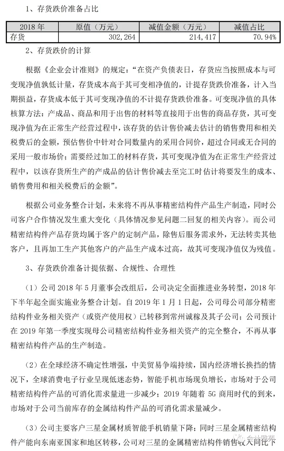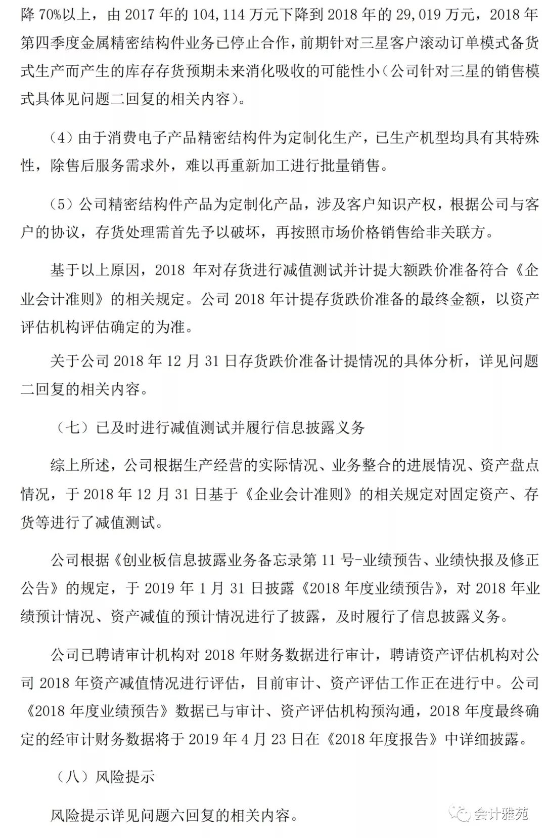 1、2019年1月31日,劲胜智能(300083)对外披露了《2018年度业绩预告》,预计亏损28.70亿元至28.75亿元,主要原因是公司对消费电子精密结构件业务的相关存货计提跌价准备21.44亿元、相关固定资产计提减值准备1.81亿元。